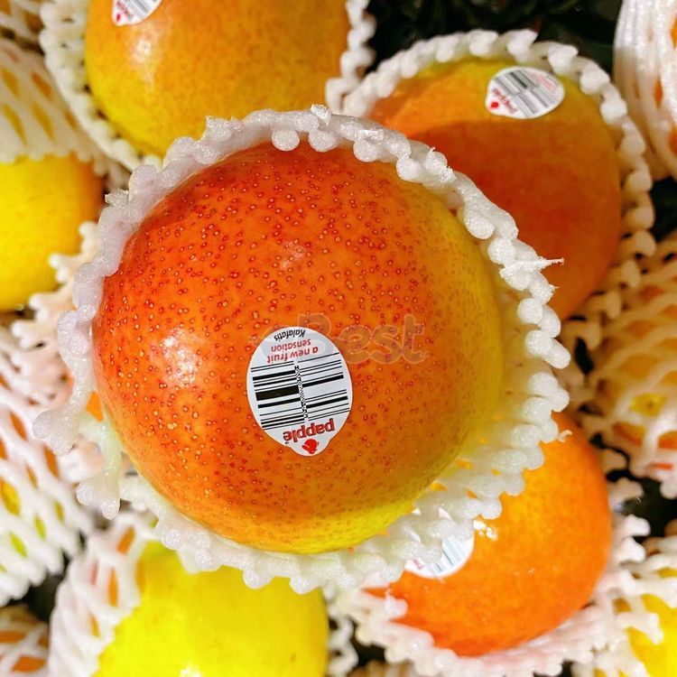 Papple is a hybrid of European and Asian pears. It is round with a red-orange blush. It looks like apple but has the texture and taste qualities of a pear. The flesh is much less tart than an apple. It is sweet and juicy.