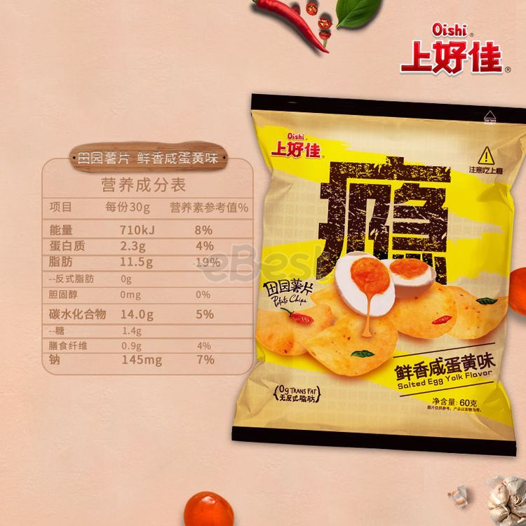 Oishi Crispy Potato Chips Salted Egg Yolk Flavor is a delicious and savory snack that combines the rich and creamy taste of salted egg yolk with crispy potato chips.