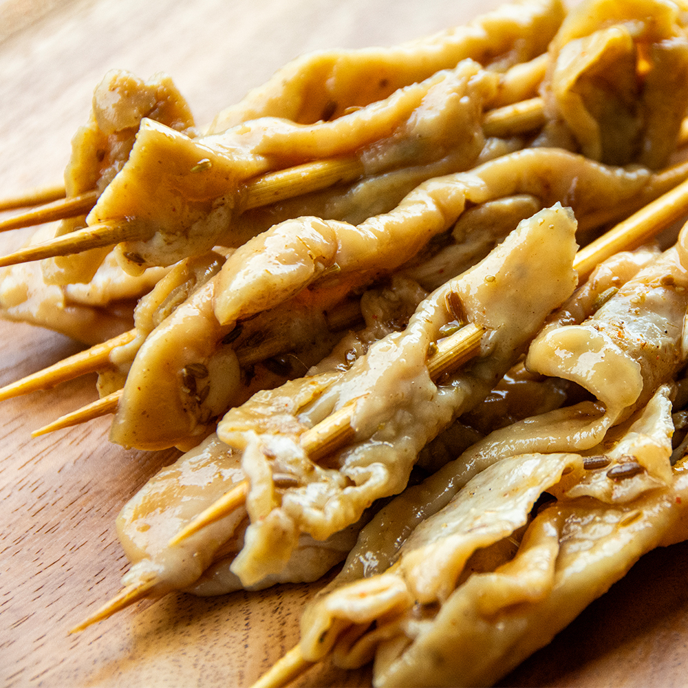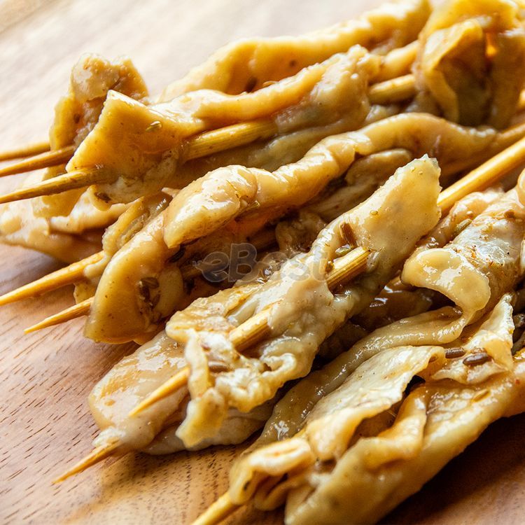 Crispy and delicious, full of aroma and rich taste. Storage method: frozen for 3 months. Product ingredients: chicken skin, green onion, cooking wine, ginger, salt, sugar, soy sauce, chicken essence, spice powder, rapeseed oil. Serving method: charcoal grilling, oven, air fryer, deep frying. Finely trimmed chicken skin, secret recipe, all hand-threaded!