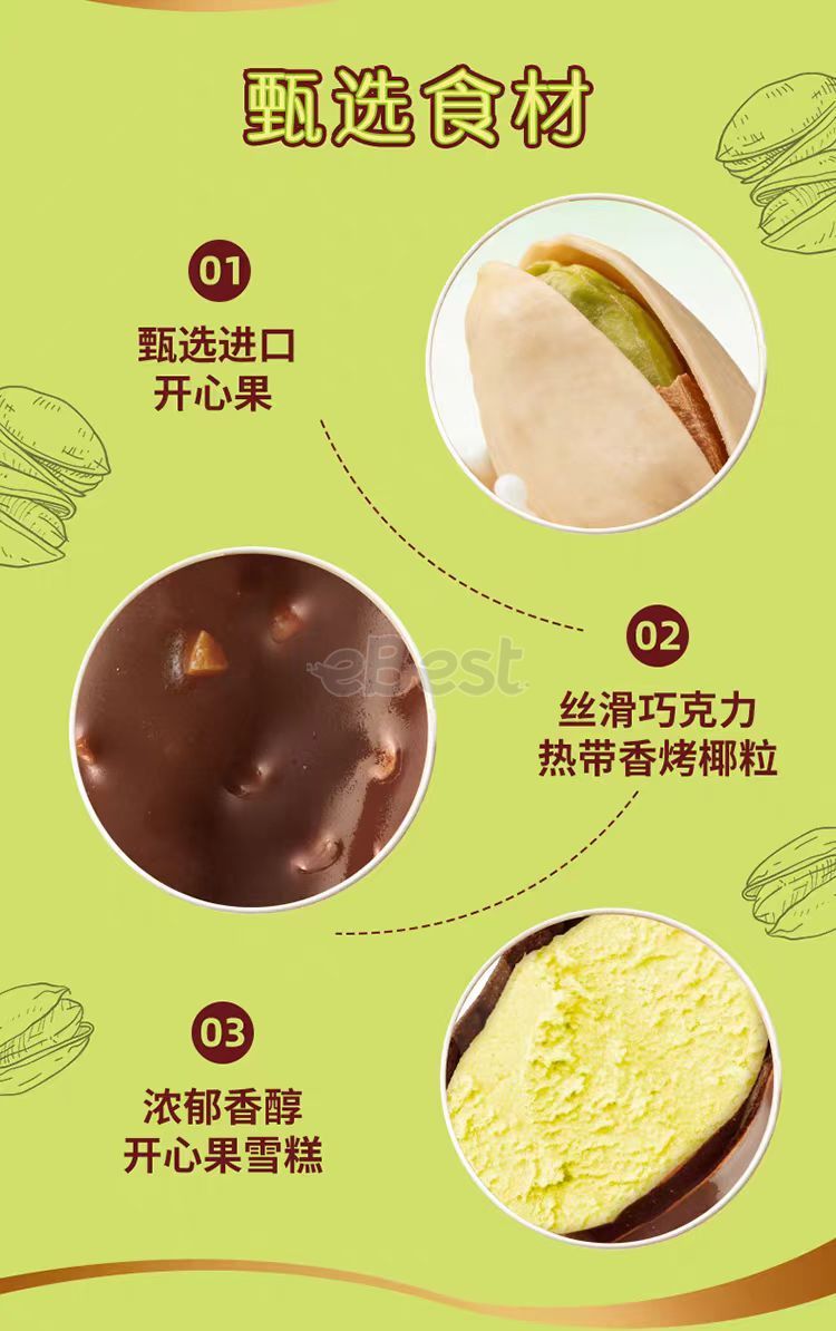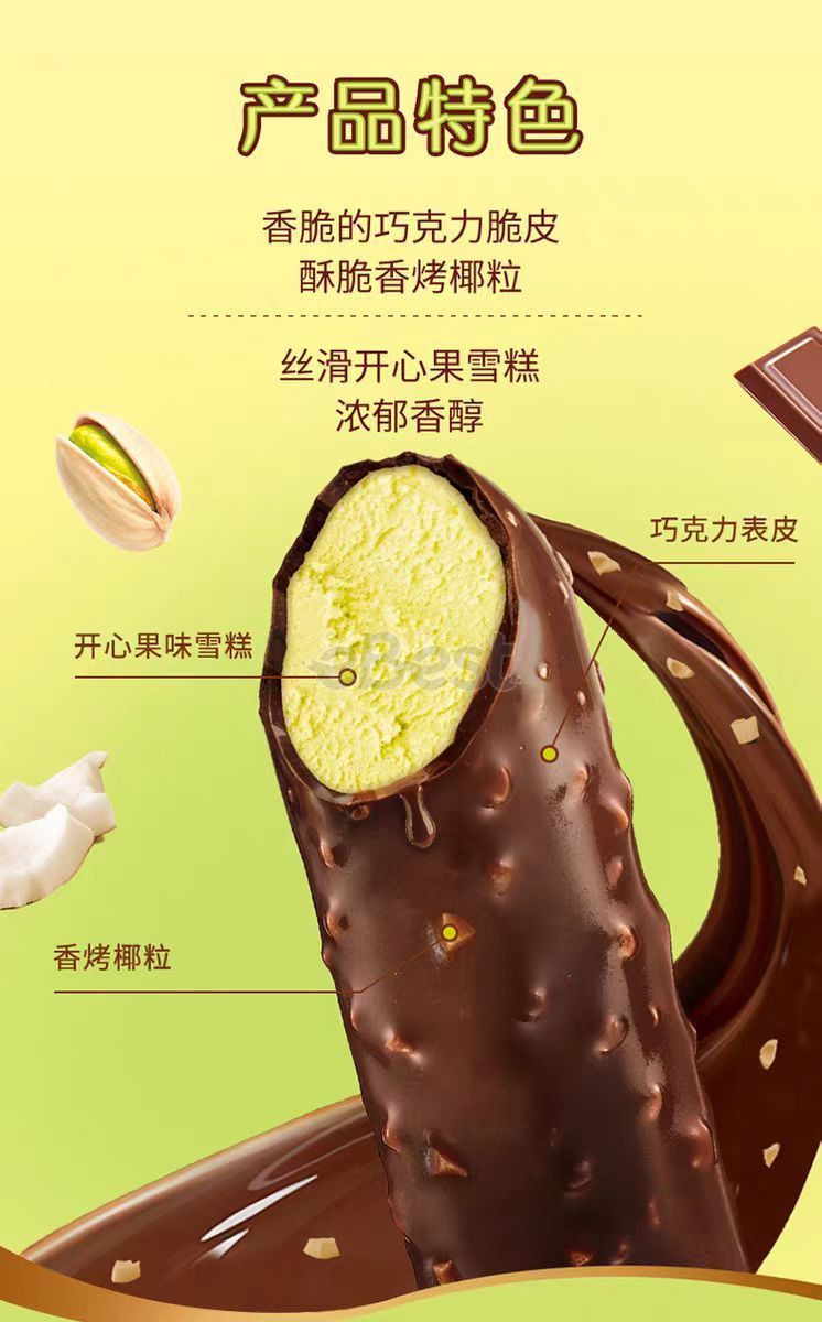 The outer layer is a rich chocolate coating mixed with real crushed pistachio pieces, offering a slightly crunchy texture. The inner core is a creamy ice cream with pistachio nut paste, its natural pale green color being the natural shade, not artificially colored. The initial taste is a slightly bitter, rich chocolate flavor, followed by a blend of pistachio's unique oily aroma and creamy sweetness. The sweetness is restrained and not cloying, the ice cream is smooth and creamy with almost no ice crystals, and the nutty aroma is long-lasting, with a refreshing and non-greasy finish. Key highlights: High-quality ingredients: Real pistachios and nut paste added, rejecting simple artificial flavorings; Rich layers: Crispy shell + creamy inner core, the richness of chocolate and the freshness of pistachio complement each other; Portable and shareable: A pack of 5 is perfect for small families/colleagues to enjoy in portions, each piece is small and easy to manage; Japanese craftsmanship: Meiji's consistently delicate ice cream texture, with a balanced ratio of oil and cream components, resulting in a smooth and non-greasy taste.